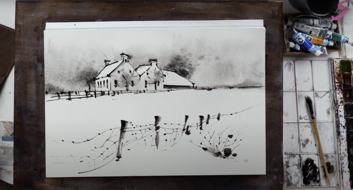 Содержание Материалы: Шаг 1 Начинаем работу с эскиза карандашом. Намечаем линию горизонта чуть выше середины листа, чтобы избежать симметрии в композиции. Рисуем забор, домики, столбы, кустарники. Помним о линейной перспективе: горизонтальные линии должны стремиться к одной точке.