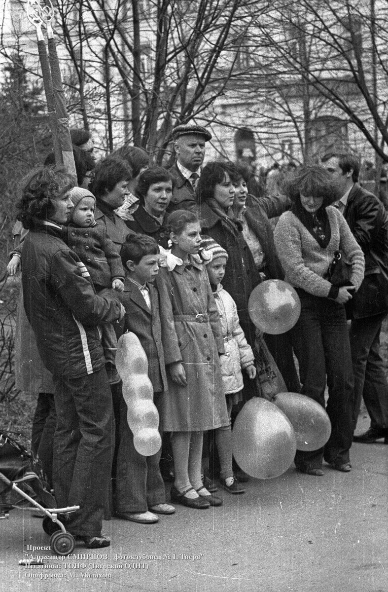 Первомай в Калинине (Тверь) в 1982 году Искал себя на фото, но не нашёл. На фото 1982 год, а вот несколькими годами раньше, когда наши пацаны со двора были ещё совсем пацанами, ходили мы на похожие демонстрации озорничать. Бегали мы там между колонн с рогаткой с венгеркой-резинкой и пуляли по шарикам пульками загнутыми из алюминиевой проволоки, а они так взрывались класно нам пацанам на потеху. Спасибо фотографу, ссылка на первоисточник ниже. источник https://vk.com/album-215698508_290771656