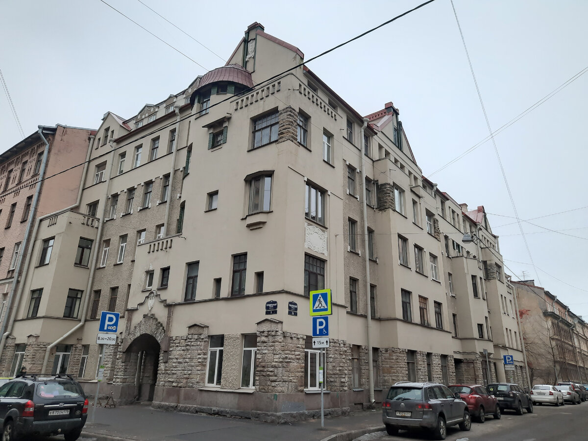 Когда видишь доходный дом Елизаветы Алексеевны Рыбиной в первый раз, то не испытываешь никаких сомнений в том, кто является автором проекта. Фирменный стиль Александра Львовича Лишневского весьма узнаваем: северный модерн с элементами готики. У здания два фасада. Более длинный выходит на Люблинский переулок: А другой обращен на Прядильный переулок. К сожалению, фасадные барельефы были утрачены во время одного из ремонтов. Потому сейчас оба фасада выглядят гораздо проще, чем задумывал архитектор. Один из доминирующих элементов фасада - гранитный портал одной из парадных, который отсылает нас к стилистике средневековых замков. А за входной дверью вас ждет настоящий готический портал, даже маски демонов есть. У этого дома есть несколько интересных особенностей. Например, паровое отопление было в доме с самого начала, поэтому тут никогда не было каминов и печей для обогрева помещений. Удивительно, но планировка почти не изменилась с 1908 года. Основное изменение - выгороженные ванные