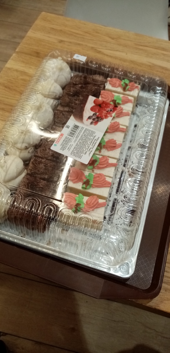 Вот признаю: прости меня, Васенька, дуру грешную ошибалась! Еще как ошибалась! Полагая, что в сетевых супермаркетах типа "подороже" цены задраны на всё, чисто-просто престижу ради. Недавно иду вдоль стеллажей Eurospar и вдруг вижу... кило пирожных. Целое чёртово кило. Причем не просрочка, я проверила :) Всего за 560 рублей. К тому же пирожные - в основной своей массе кремовые, те самые вредные, которые я ела в детстве, и с тех пор почему-то едала ну оооочень редко! Не, так-то они во многих кондитерских присутствуют на выкладке на витрине; но обычно рублей по 200-300 штучка. А 200+ рэ за одну кремовую пироженку Я-не-Пряника жаба душит отваливать 🙄 А тут!.. 27 пирожных!!! Плюс еще и целый ряд безе! 😍 Короче, как в анекдоте: увидела их, дальше - вспышка, дальше не помню, дальше я у кассы с коробкой и чеком в руках 😁 Хорошо хоть 2 коробки в экстазе не купила. Взяла себе чаю, за столиком радостно подсчитывала профит. Это на фото еще не полный комплект! Можете сами посчитать