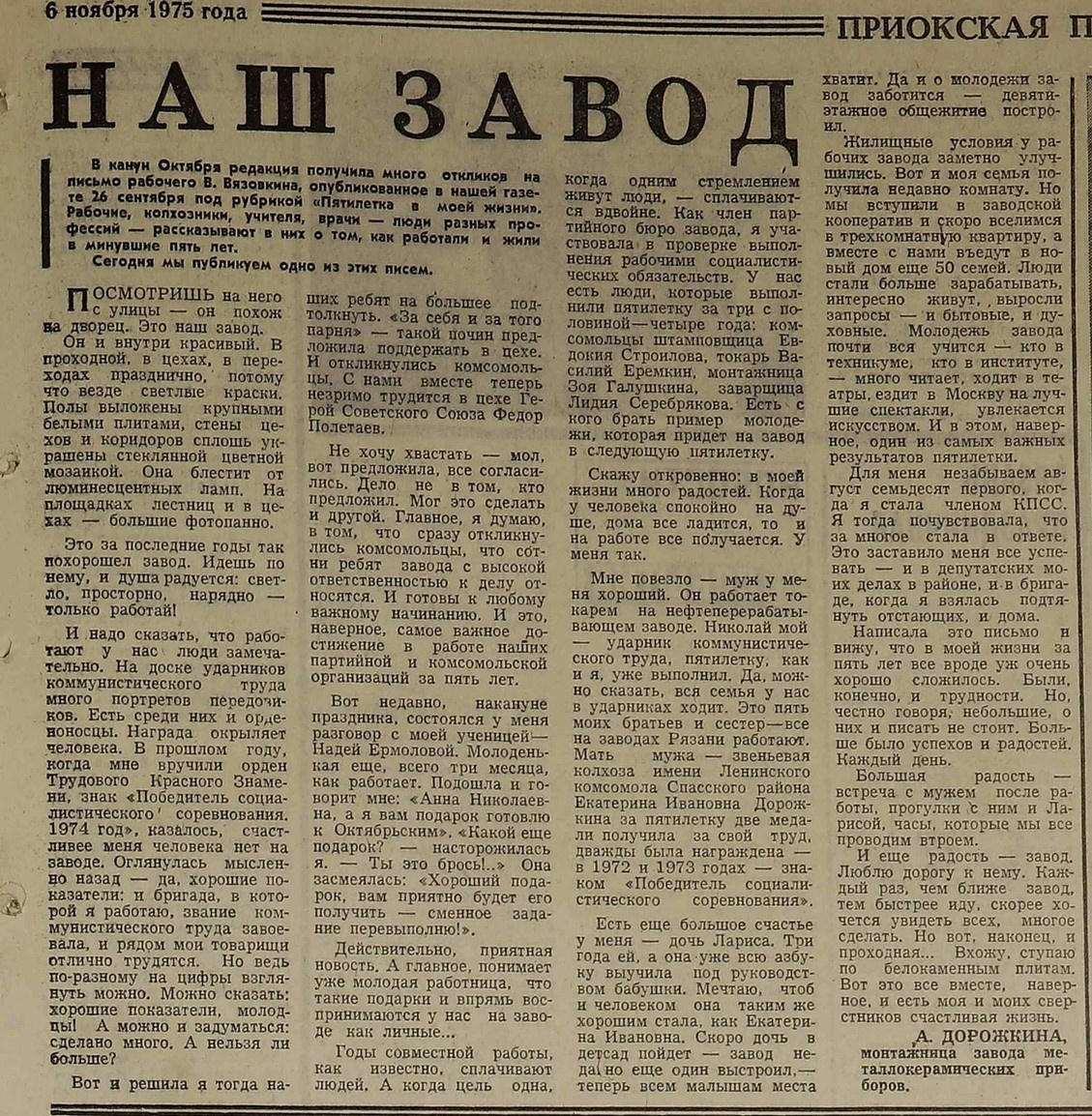 Мать мужа — звеньевая колхоза имени Ленинского комсомола Спасского района Екатерина Ивановна Дорожкина за пятилетку две медали получила за свой труд, дважды была награждена —в 1972 и 1973 годах — знаком «Победитель социалистического соревнования».