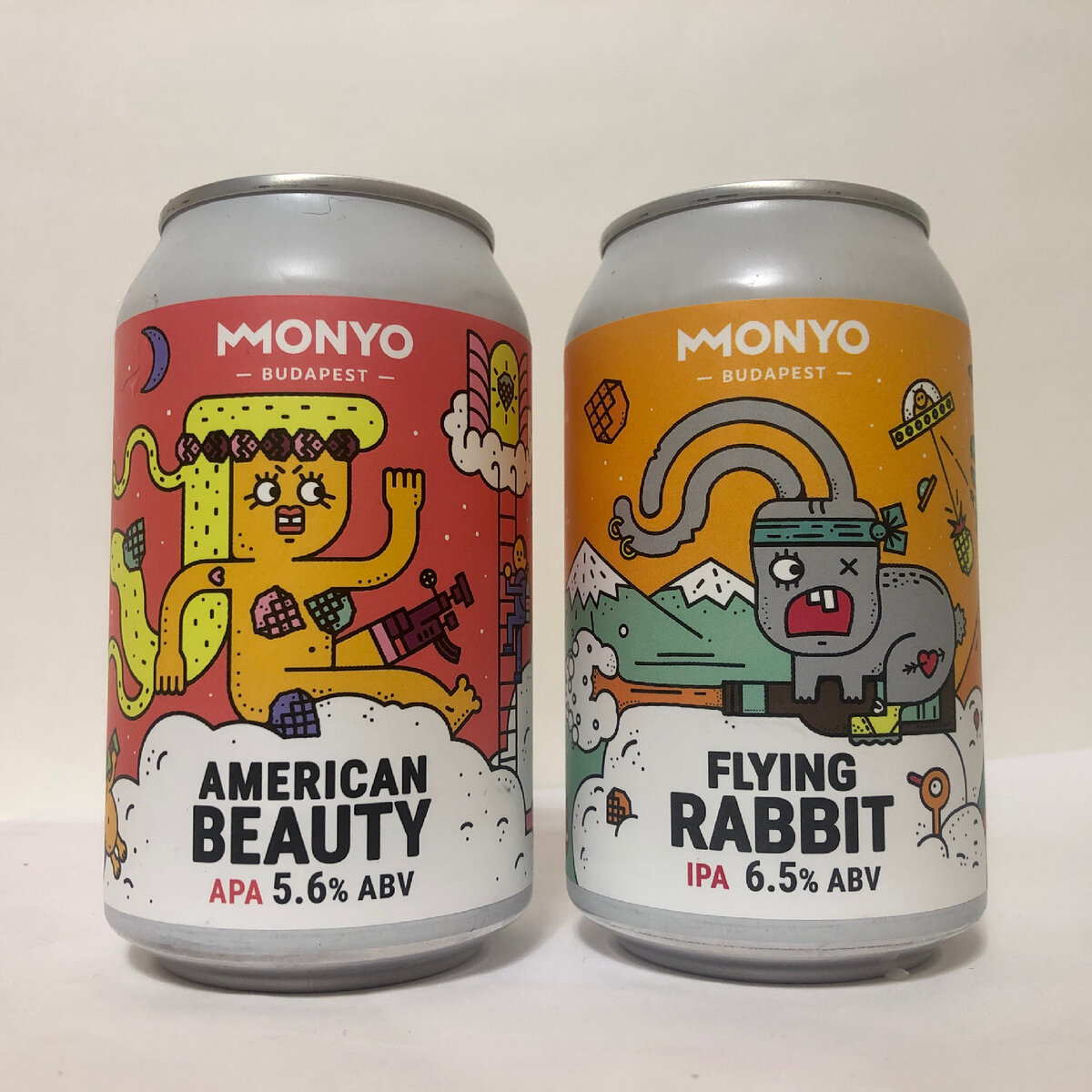 Как Вам словосочетание «венгерский крафт»? Необычно, не правда ли?! Что же это такое, и чего от него ждать? За ответами я отправился в Магнит, где прикупил пару симпатичных баночек пива Monyo - American Beauty и Flying Rabbit. APA и IPA, соответсвенно. В этом году пивоварне Monyo, что в Будапеште, «стукнуло» девять лет. Началась история с того, что владельцу паба Monyo Пейну Адаму надоело поить посетителей плохим пивом - дескать, крафт в 2014 году был нестабильного качества. Вот он и решил варить свое собственное пиво. А так как для варки пива нужен пивовар, его познакомили с контрактным пивоваром Неметом Анти. В итоге, за пол года парни построили свою пивоварню, на которой в настоящий момент трудятся уже 13 человек. За все время сварено около восьмидесяти сортов, налажены логистические связи со многими странами, а продукция побеждает на всяких конкурсах. Начнем знакомство с американского светлого эля American Beauty. Обратите внимание на дизайн этикетки. Все моньевское пиво выполне