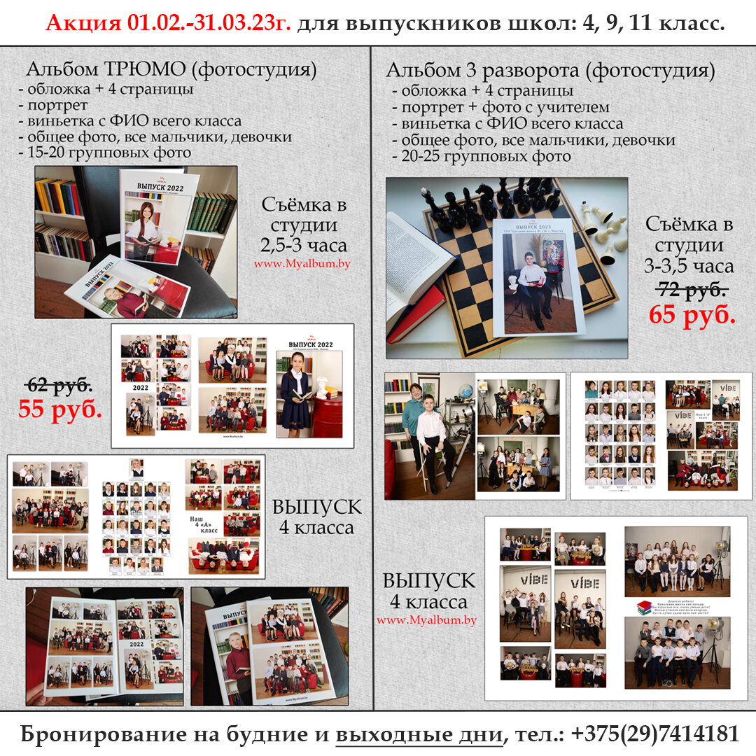 Акция с 01.02.- 31.03.2023г. для выпускников школ: 4, 9, 11 класс! СКИДКА на самые популярные выпускные альбомы: Трюмо, альбом на 3 разворота с фотосессией в нашей фотостудии, г. Минск, пр. Машерова 17/710. 1. Воплощение любых идей выпускников, а также смена образов (можно переодеться несколько раз); 2. Нет взрослых, учителей, которые смущают и мешают фотографироваться; 3. Не нужно никаких разрешительных документов администрации школы, только решение выпускников и родителей; 4. Гарантированный результат: в студии 6 готовых фотозон, 6 фонов на выбор, а также 3 источника импульсного освещения; 5. Поможем в постановке, покажем все фото для выбора в альбом на месте; 6. К нам легко добраться каждому, мы в центре на пр. Машерова 17/710; 7. У нас большое пространство для комфортной съёмки (70 кв. м.) и новых впечатлений! P.S. После получения готовых альбомов, мы отдаём все фото со съёмки! Подробнее об АКЦИИ и фотостудии для выпускников Минск по ссылке: https://myalbum.by/akciya-2023/ Брониров