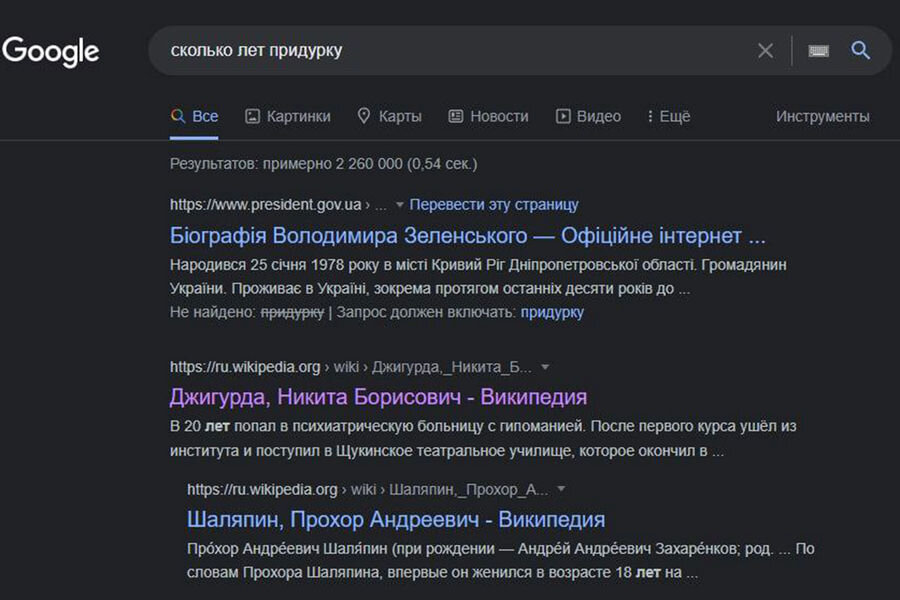Google на запрос «сколько лет придурку» выдает ссылку на биографию Зеленского...