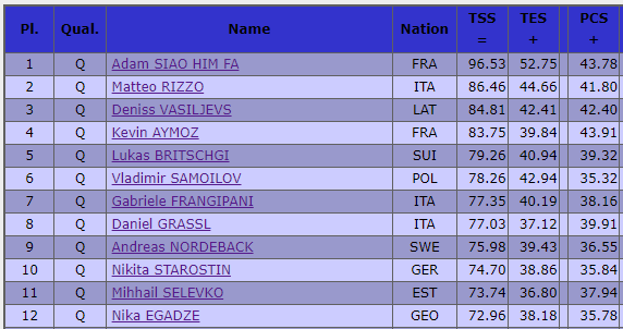 Абсолютный герой дня Адам Сиао Хим Фа (96.53 - 1 место). 21-летний француз кроме чистого исполнения сложнейшего набора прыжковых элементов с двумя четверными прыжками отметился потрясающей по своей сложности и динамичности дорожкой шагов, требующей в том числе очень хорошей акробатической подготовки. За последние 2 года у Адама огромный прогресс по всем направлениям. Здесь и сейчас он должен выигрывать этот турнир, +10 баллов от всех остальных.