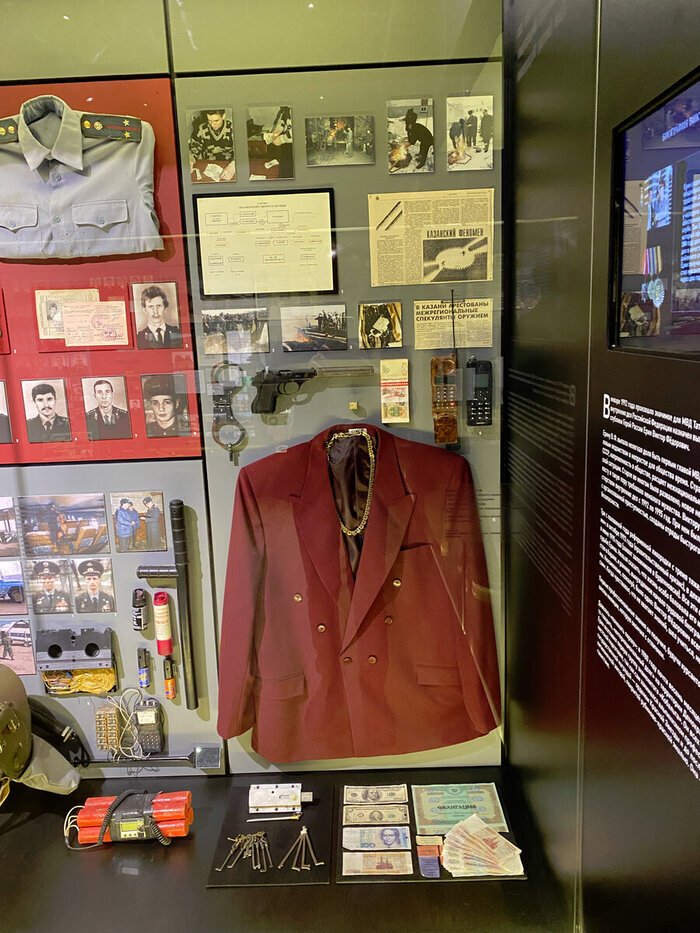 Всем привет. Внимание! Все предметы на фото, являются музейными экспонатами и представляют историческую ценность! Перевалили за доброю половину, по экспозиций. Перемещаться в 90-е года... И сразу-же встречают атрибуты того времени - малиновый пиджак, золотая цепь, первые сотовые: Это, кстати костюм, принадлежал оперативному сотруднику, который был внедрен в одну из ОПГ. С появлением современной копировальной, стали появляться фальшивки. Причем не только деньги, но и разные другие финансовые документы. В том числе и облигации, ваучеры и прочее. Тут небольшой уголок, посвященный школе милиции: Скромно, хоть и прямо не относящееся к этим годам, экспозиция посвященная Афганской Войне. Хотя почему - не прямо? Многие молодые сотрудники того времени, прошли через ее горнило: Тут-же награды и наградное оружие: Мундир одного из министров - полного генерала и Героя РФ: С удивлением узнал, что в милиции был свой летный отряд, со своей формой: Тут пришло время Второй Чеченской, где активно принима