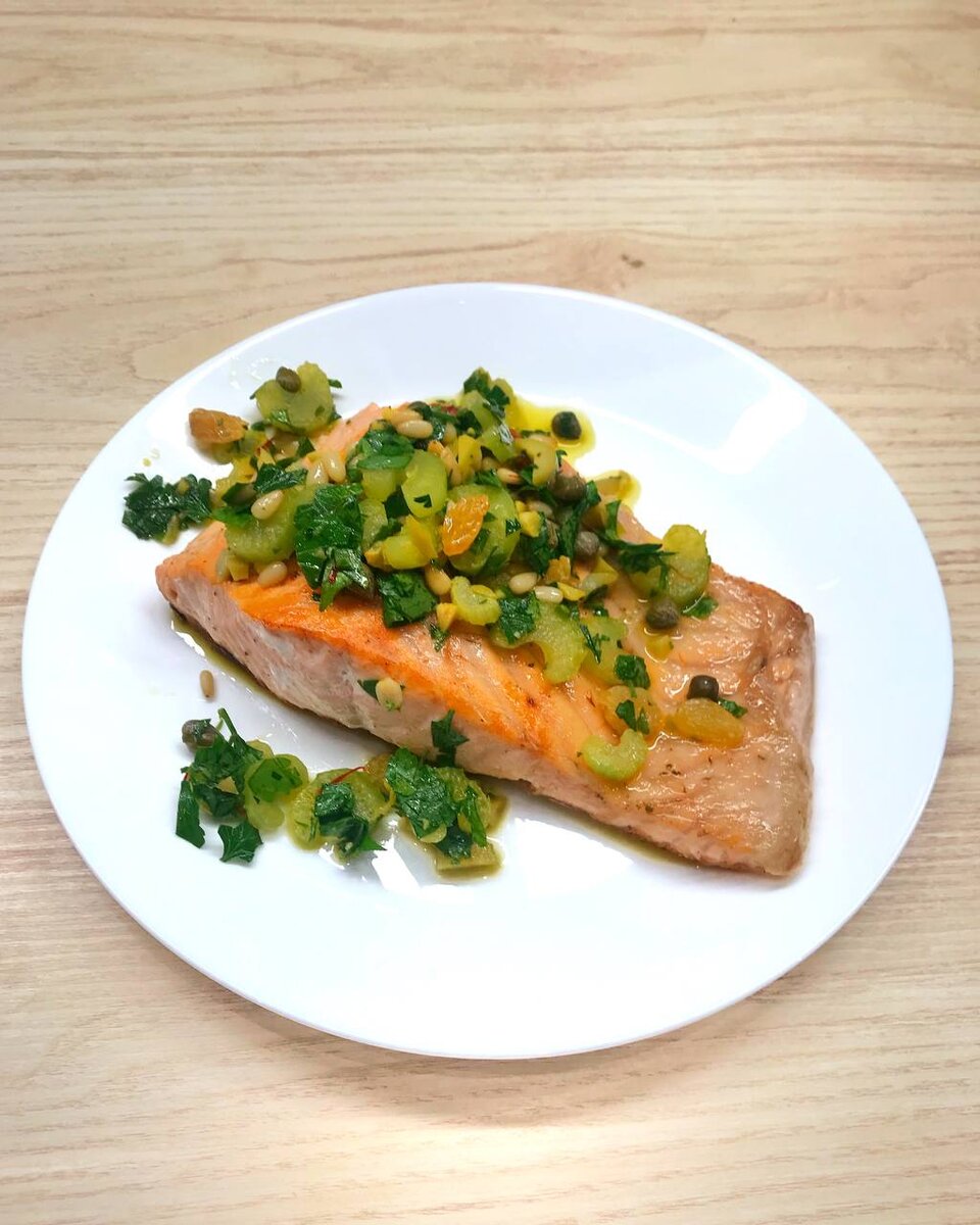Разогреть сковородку. Влить около 5 ст.л. оливкового масла, добавить сельдерей и кедровые орешки. Жарить, постоянно помешивая 4-5 минут, орешки должны стать золотистыми, но не пригореть. Смешать сельдерей и орешки с каперсами, рассолом, оливками, шафраном (вместе с водой), изюмом, петрушкой, цедрой и лимонным соком, приправить щепоткой соли.