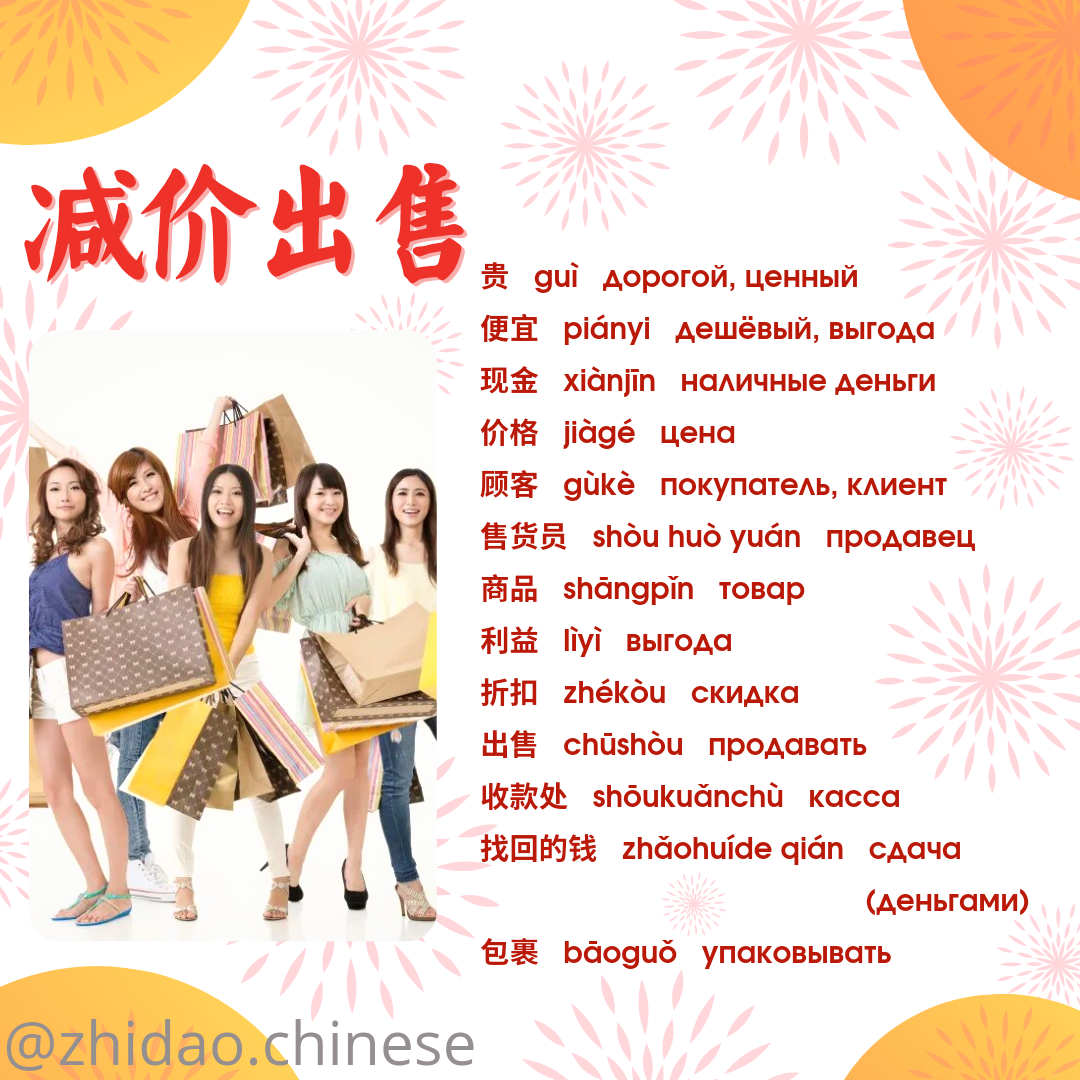 #zhidao_подборка_слов Тема: Распродажа (减价出售 jiǎnjià chūshòu) 🛒 🔸贵 guì дорогой, ценный 🔸便宜 piányi дешёвый, выгода 🔸现金 xiànjīn наличные деньги 🔸价格 jiàgé цена 🔸顾客 gùkè покупатель, клиент 🔸售货员 shòu huò yuán продавец 🔸商品 shāngpǐn товар 🔸利益 lìyì выгода 🔸折扣 zhékòu скидка 🔸出售 chūshòu продавать 🔸收款处 shōukuǎnchù касса 🔸找回的钱 zhǎohuíde qián сдача (деньгами) 🔸包裹 bāoguǒ упаковывать 📝 Ссылка на карточки Quizlet для изучения новых слов: https://quizlet.com/_cod88d?x=1jqt&i=2r5snr ❗В Quizlet вы можете послушать произношение всех слов! Для этого в различных режимах изучения или при просмотре списка слов нажмите на значок микрофона 🔊 📚 Хотите, чтобы Вы или Ваш ребенок заговорили на китайском? Напишите нам для записи на групповые / индивидуальные занятия! 🎓 #china #chinese #школакитайского #китайский #москва #язык #китайскиймосква #учукитайский