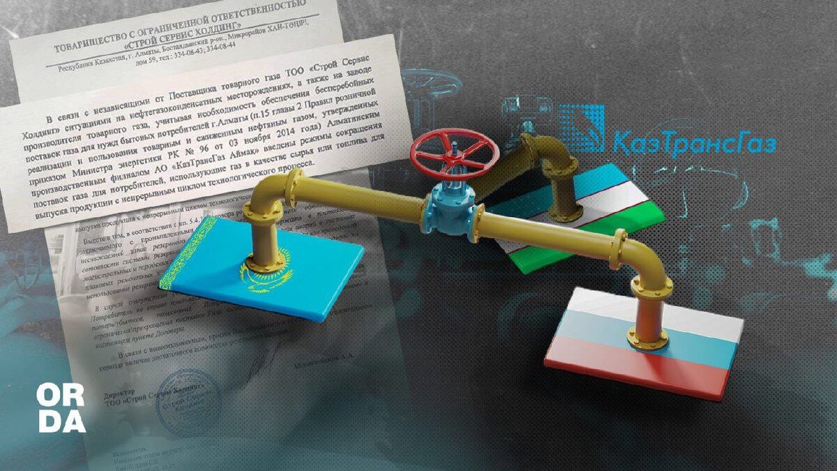 ТОО «Строй Сервис Холдинг» разослало коммунально-бытовым потребителям письмо, сообщив что алматинский филиал «КазТрансГаз Аймак» сокращает поставки или вовсе их прекратит, но не для всех. Под действие якобы попали только крупные потребители, такие как нефтегазовые, металлургические и пищевые предприятия.
