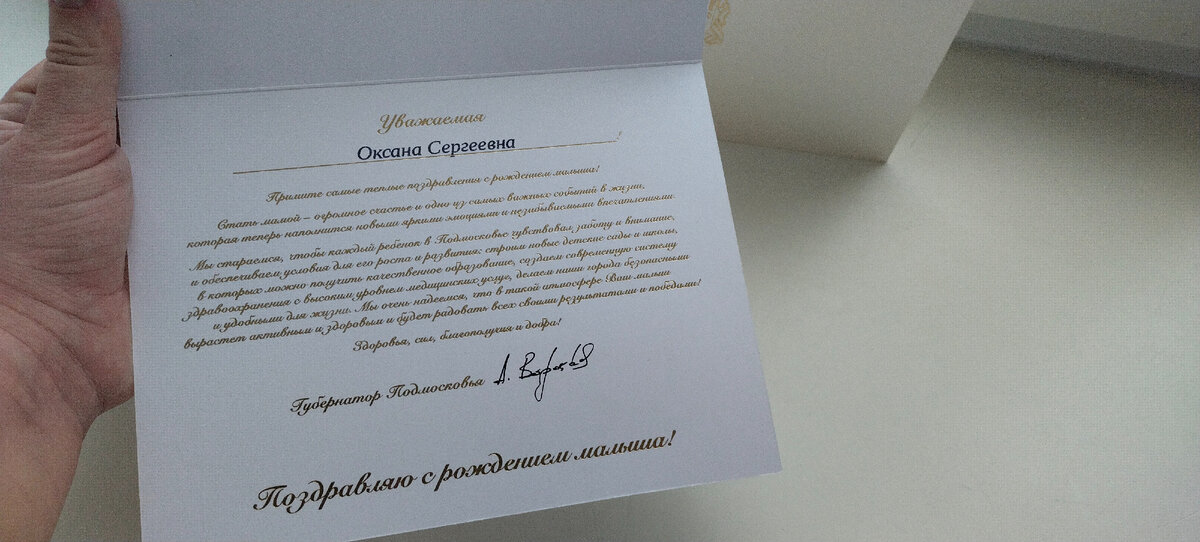 Поздравления и внимание- это всегда приятно! А получать поздравления в связи с рождением ребёнка- это просто мега приятно! 🤗 Вчера рассказала о том, как в приёмном покое чуть не родила. А сегодня хочу рассказать о приятностях и внимании.🎁🤗👍 Ведь один сотрудник- это не показатель всей системы. И нужно стараться видеть лучшее и доброе! Так вот! Первая приятность- это поздравление от губернатора московской области! Вот уж неожиданно, так неожиданно! Поздравил раньше мужа и родных! 👍Как будто у ворот стоял, ждал окончания родов, что бы быть первым! 🤣 Просто шикарнейший конверт. В таких дома ценные вещи хранят, свидетельства разные. Сердцу памятные фотографии. К слову, СНИЛС теперь в пластике не делают)) Распечатывают на обычном А4, если необходимо.. Другой приятностью стал пакет с разной мелочёвкой для ребёнка. Чаёк сразу выпила. Был ещё пакет с какой то кисломолочной смесью в пачках по 200 мл. Отдала его дочке двухлетней домой, как гостинец от мамки, неожиданно исчезнувшей. Ещё о