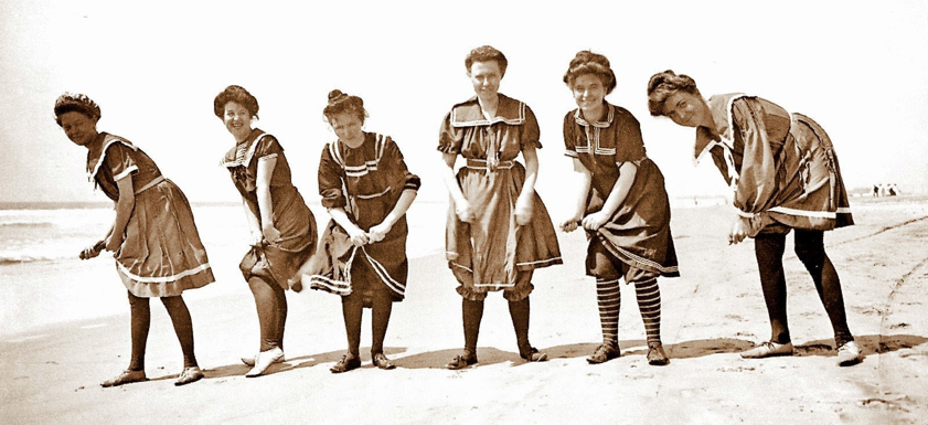 Что нужно современной девушке, женщине для того, чтобы посетить пляж? Соответствующая погода да купальник и, пожалуй, всё! Было бы желание. Но всего чуть более полутора века назад всё было далеко не просто. В XIX веке, купание постепенно перестало быть исключительно гигиенической процедурой, когда в моду вошли морские ванны. Тогда же появился и купальник, примерно в 1850 году, когда французская аристократия полюбила морское купание и вторглась на пляжи Нормандии или, южнее, на пляжи Руайана и Биаррица. С появлением купальников стали появляться и запреты. И если для мужчин все было проще, то для женщин было все значительно сложнее. Существующий тогда пляжный этикет имел весомое значение в обществе и строго соблюдался жителями таких стран, как США, Великобритания, Германия, Франция, Мексика. Женщина на пляже не могла предстать в купальнике перед мужчиной. Такой выход осуждался обществом и считался дурным тоном. Женский пляжный наряд должен был состоять минимум из шести различных элемен