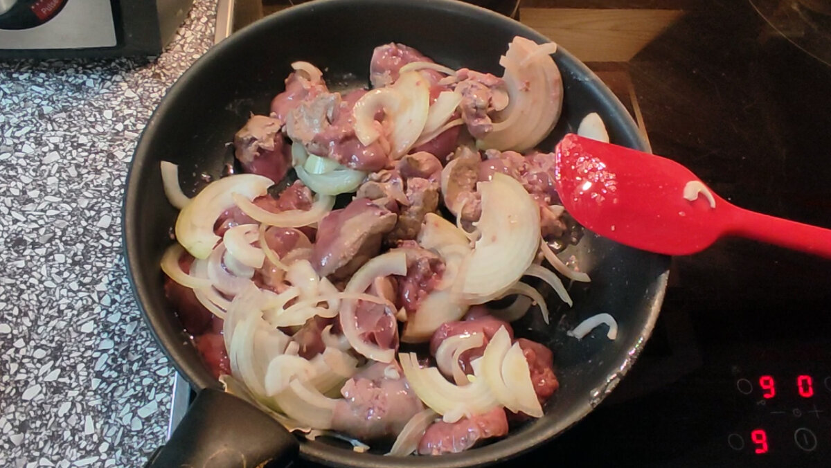 - В сковороду наливаю буквально 1 ст. ложку растительного, лучше оливкового, масла, выкладываю печень и даю ей закипеть. После этого добавляю лук и перемешиваю.