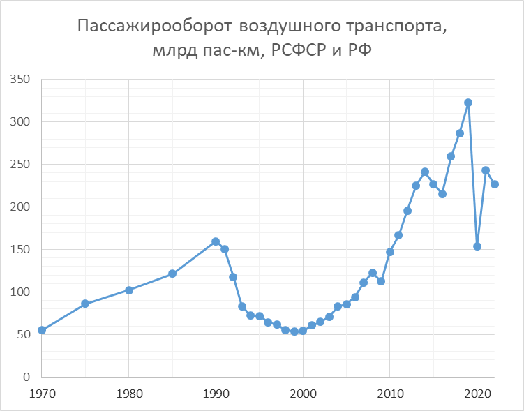 В ЕМИСС опубликовали данные за декабрь. Ну что ж, давайте посмотрим на пассажирооборот воздушного транспорта. Видно, что он снизился, но не так драматично, как в 2020-м. Примерно как в 2015-м. Чтоб лучше понять динамику и избавиться от сезонности, посмотрим на скользящие суммы за 12 месяцев за каждый месяц. Как можно заметить, в декабре спад несколько замедлился, этот вклад внесли международные перелёты (Таиланд, говорят, открылся?). Но в целом по ним большой спад, и он продолжается. Внутренние же перевозки, после некоторого снижения в марте-июне, поставили в этом году абсолютный рекорд, 169 млрд. пассажирокилометров. Для иллюстрации, добавлю графики с группировкой по месяцам. И скользящие суммы, совмещённые с данными за прошлое. Тут видно, что спад за март-декабрь 2022-го примерно соответствует по скорости спаду в 1992-93 годах в абсолютных цифрах. В относительных, конечно же, он меньше, т.к. база выше. Но в абсолютных за февраль-декабрь 2022 имеем -28,5. А в 1992-м было -32,7 по срав