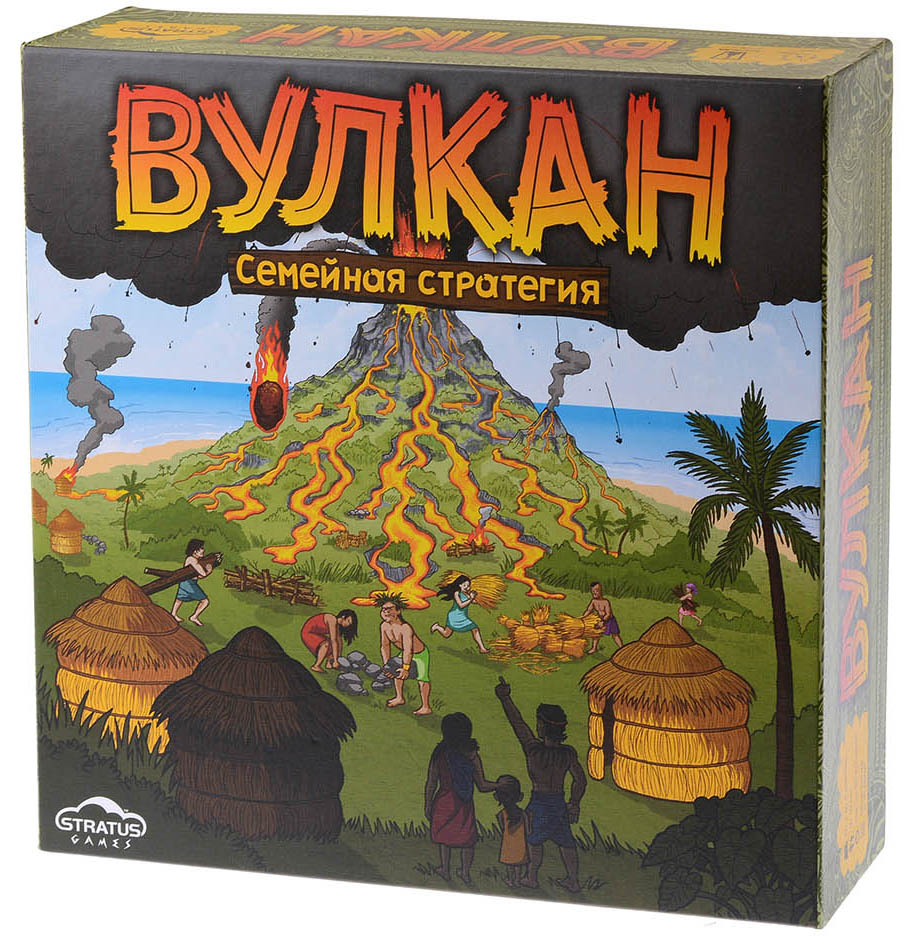 Караул! На нашем острове проснулся вулкан! Давайте направим потоки в соседнюю деревню, наша целее будет... Сегодня рассказ о настольной игре "Вулкан". Это игра для 2-6 человек на выставление тайлов на общем поле. В центре поля изображен вулкан, игроки по очереди выставляют тайлы с изображенными потоками лавы, направляя их к деревням соперников расположенным по краям поля. Побеждает игрок деревня которого наименее пострадала от извержения, либо когда все деревни соперников сгорят. Кроме выставления тайлов с потоками игроки в свой ход могут строить препятствия на пути лавы, а так же разыгрывать карты событий, которые игрок получает при подведении потоков лавы к чужой деревне. Карты позволяют поменять, развернуть или убрать тайл с потоками лавы, охладить свою деревню, еще их можно обменять на препятствия или дополнительные тайлы. В коробке с игрой находится игровое поле, шестигранные тайлы потоков лавы, колода карт событий, картонные фишки игроков (показывают температуру в деревне), де