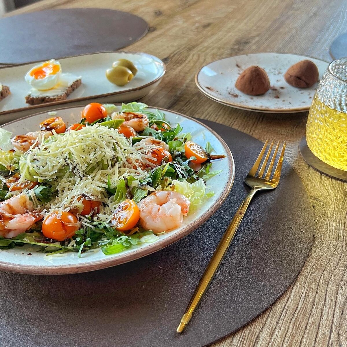 Салат с креветками, авокадо, помидорками-черри, рукколой и пармезаном. Каждый раз, когда речь заходит о похудении, на ум приходят картинки с вареной куриной грудкой, паровыми котлетами и отварными овощами и прочими постными блюдами, от которых не жизнь, а тоска и депрессия. Кажется, что похудение - это удел самых сильных духом людей, которые готовы идти на колоссальные жертвы, ради красивой фигуры. Поэтому, так часто мы слышим от людей «Я не могу похудеть! У меня силы воли нет!» А что если я вам скажу, что вы сможете похудеть легко, питаясь очень вкусно, разнообразно и без усилий над собой?! Все очень просто! Надо лишь изменить в своей голове сложившиеся в обществе стереотипы и изменить в своем пищевом поведении лишь одно: питаться так, чтобы больше 2-х раз за день тебе есть не захотелось. Это должны быть достаточно жирные и вкусные блюда, с сочетанием всех вкусом и текстур: сладкое, соленое, горькое, кислое, острое, терпкое… хрустящее, нежное, мягкое, твердое… Все ваши рецепт