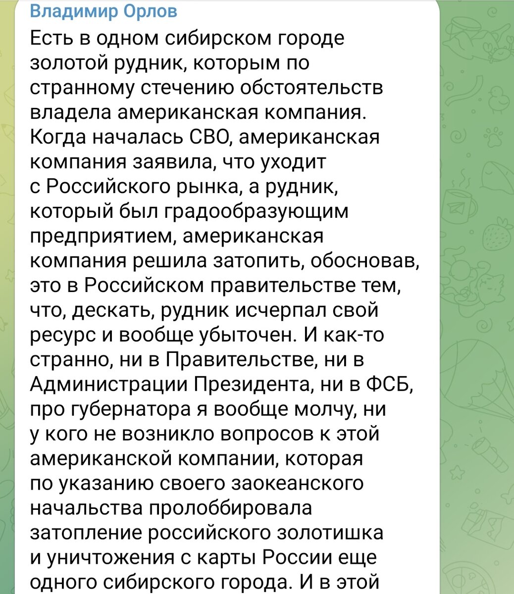 На днях разразился настоящий скандал - из-за якобы намеренного затопления американцами золотоносного рудника где-то в Сибири. Вредительство в чистом виде. Ну, и опять же якобы, полном бездействии властей и контролирующих органов. Давайте разбираться, что в этой истории правда, а что не совсем... Всё началось вот с этого поста Владимира Орлова: Источник: Ну, и все без разбора на доверии тут же просто перепечатали этот текст. Что же в этом посте подтверждено фактами. Речь вероятнее всего идёт о шахтах в Забайкалье - Дарсуновском месторождении. Летом прошлого года жители посёлка Вершино-Дарасунский (в посёлке зарегистрировано около 5000 жителей) забили тревогу: Градообразующее предприятие закрывается, как быть людям без работы и зарплаты не понятно. Когда свои хуже чужих Только вот хозяева шахт никакие не американцы-британцы. А наши родненькие скрепные олигархи, ставящие во главу угла извлечение прибыли. Владимира Орлова, возможно, смутило название компании - Highland Gold Mining,