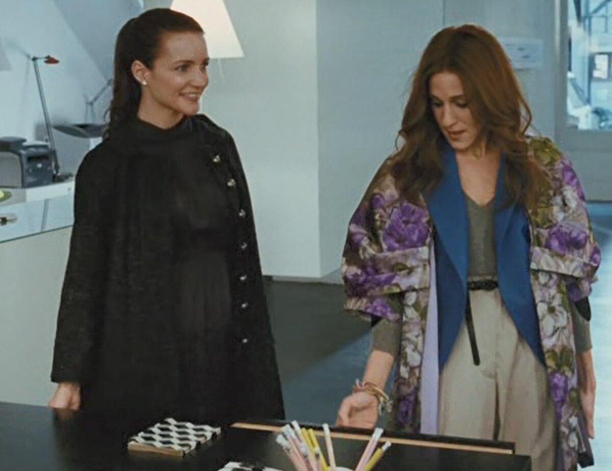 05 – сцена, которую очень сложно было снять, как поделился потом продюссер фильма и сериала Майкл Патрик Кинг - канун Нового Года, который и Кэрри, и Миранда встречают в одиночестве в статусе свободных девушек. Съемки велись в теплую погоду, снег был искусственным и жителей улицы пришлось уговорить для установки новогодних декораций. Миранда была слишком расстроена от перспективы встречать Новый год одной с китайской едой, и Кэрри поспешила к подруге - степень ее желания была такова, что она даже поехала на метро, что не было ей свойвственно вообще. Образ, собранный наспех, получался весьма интересным - винтажная шуба из сериала поверх пижамы (степень предсказания тенденций уровня бог, пижамные костюмы вошли в моду только несколько лет назад, а это 2008!), сверкающая шапочка из пайеток и ботильоны на каблуках Chanel.