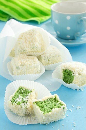 Птифур Очень люблю маленькие пирожные, птифуры, на один укус. Их хорошо готовить для вечеринки, фуршета, девичника, когда совсем не обязательно чинно сидеть за сервированным столом. И лакомиться ими в непринужденной обстановке, с чашечкой чая или даже бокальчиком легкого белого вина... На вкус они просто нежнейшие! Бисквит просто тает во рту, да еще пахнут кокосом и чаем матча. А еще очень необычные- зеленые! Вам потребуется: - 90 г сахарной пудры, - 90 г муки, - 100-150 г кокосовой стружки, - 150 г сливочного масла, - 80 г сгущенного молока. Как готовить: 1. Квадратную форму диаметром 20 см. на 20 см. выстелить листами пекарской бумаги, смазанной сливочным маслом. Духовку разогреть до 180 град. Сгущенной молоко и масло оставить при комнатной температуре на 2- 3 часа. 2. Яйца взбить с пудрой до пышности. Добавить матчу. Осторожно лопаткой вмешать муку и растопленное охлажденное сливочное масло. Выложить массу в форму и выпекать около 12-15 минут. Остудить. Выложить из формы и на