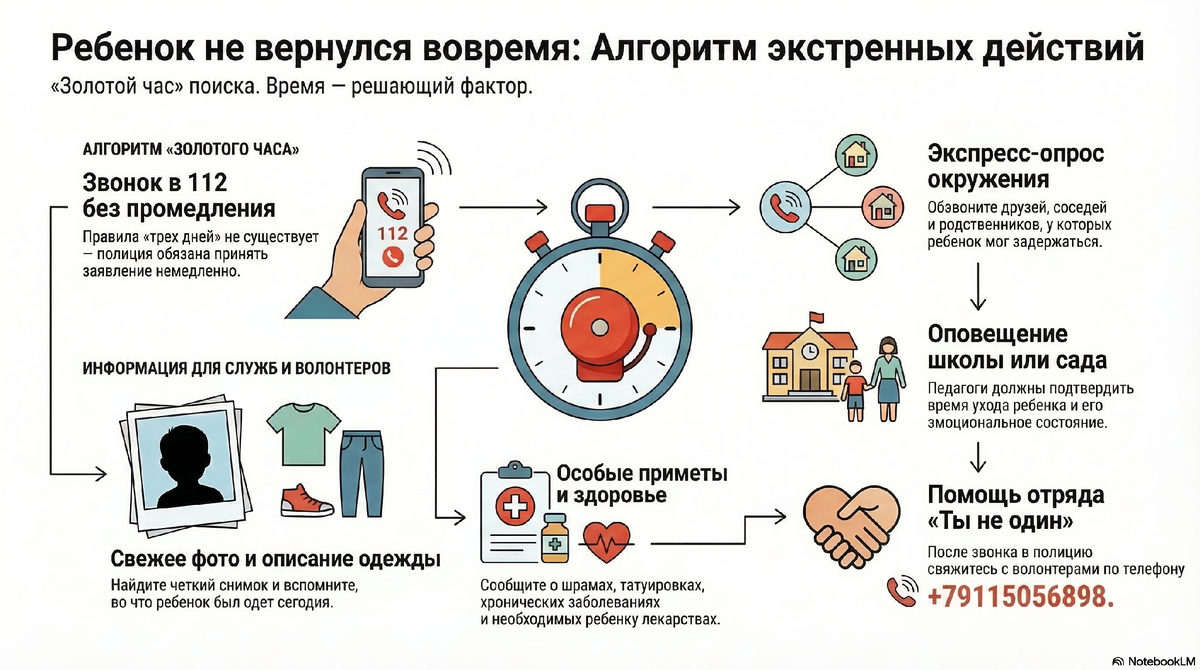 Я — представитель ПСО «Ты не один». Мы ищем людей. И мы знаем: первые 2-3 часа решают всё. В этой статье не будет воды. Только четкий план действий для родителей и учителей. Сохраните в заметки — пусть эта инструкция никогда не пригодится, но если что, она будет под рукой.