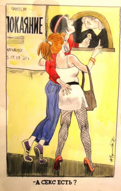 Рисунок Жозефа Ефимовского (1930—2019). «— А секс есть?». 1989 год. Художник осуждает легкомысленное отношение к фильму «Покаяние»