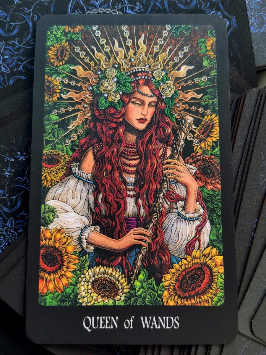 Дама Жезлов олицетворяет женскую сторону стихии огня. Она символизирует радость жизни и жажду счастья в такой степени, что это может вылиться в чистую жажду наслаждений, в самую расточительную трату душевных сил. Но в целом женская сторона огня выражает глубочайшее доверие себе, своей самобытной природе, своей внутренней силе. Королева Жезлов освоила самосознание до такой степени