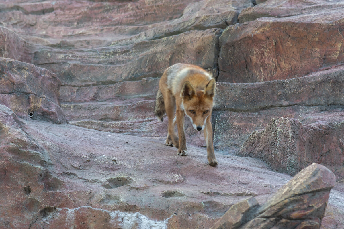 Лисица спокойно спускалась по горке, а я судорожно пыталась поймать ее в фокус. Приблизилась к нам, а у нас и нет ничего вкусного. Да и на входе в океанариум табличка висит, запрещающая кормить диких животных. Мы ещё пошутили тогда на тему о том, кого тут можно прикормить – кругом лишь пластиковые динозавры и осьминоги.