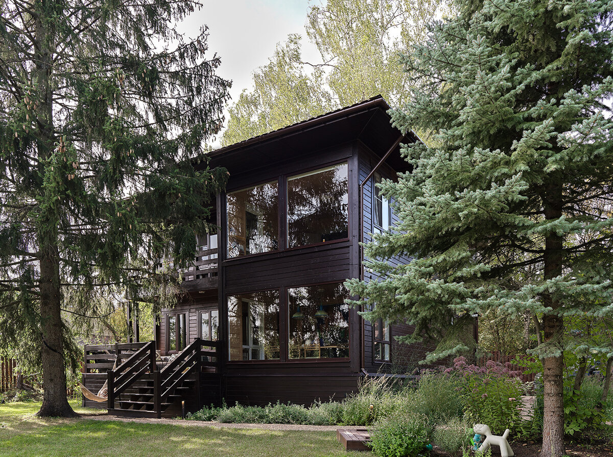 «Этот участок земли достался нам по наследству, — рассказывает хозяйка дома, дизайнер и соосновательница BHD Studio Екатерина Нечаева. — Прадед мужа был архитектором, и в конце 1960-х получил участок. Это был дачный дом с духом влюбленной в жизнь интеллигентной московской семьи. Здесь пили портвейн и собирали библиотеку, играли в карты, проживали лето в ситцевых сарафанах и соломенных шляпах, ходили на реку. Сердцем дома была полукруглая стеклянная веранда с буфетом, двери которого не закрывались». «Старый дом снесли, участок стоял пустым. На 14 сотках растут три столетние ели, орешник, акация и три старые березы и молодой клен, принесенный ветром и семь яблонь разных сортов. Во время беременности я в первый раз в жизни начала планировать больше чем на полгода вперед. Тогда я подумала, что, когда родится ребенок, я бы хотела жить за городом. 11 февраля 2020 года были вбиты сваи, а в апреле мы уже красили фасад готового дома. Над планировкой думать не пришлось. Она до сих пор мне кажетс