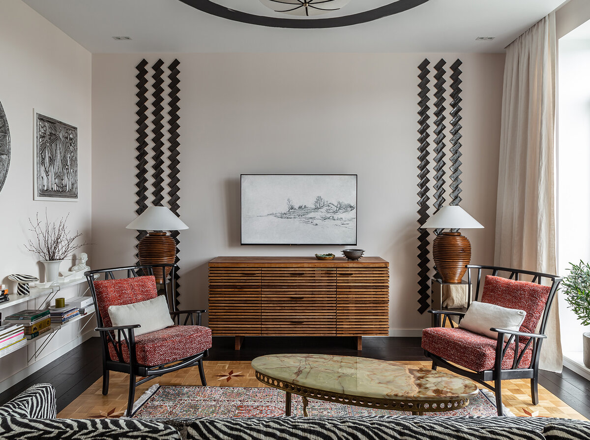 Двухэтажная квартира с окнами в пол и с выходом на эксплуатируемую кровлю принадлежит дизайнеру Ирине Лаврентьевой, совладелице бюро Lavka-design, и ее семьи из четырех человек. На 128 кв. метрах расположились четыре комнаты, включая объединенное пространство кухни и гостиной, две гардеробные, санузел, вместительная кладовка под лестницей и коридор. «Сначала я сконцентрировалась на планировке. Надо было предусмотреть все мелочи: начиная от расположения комнат и того, кто в какой из них будет жить, заканчивая продуманным хранением всех хозяйственных предметов». От второй ванной комнаты пришлось отказаться в пользу шкафа для прихожей. Неудачное расположение этого санузла не позволяло поставить шкаф в прихожую, из-за чего обувь и одежду приходилось бы уносить каждый раз вглубь квартиры, что неудобно. Также еще одна сложность была связана с вентиляционным стояком дома на втором этаже, который расположен посередине комнаты. Он резал пространство на две части и не давала комфортно расположит