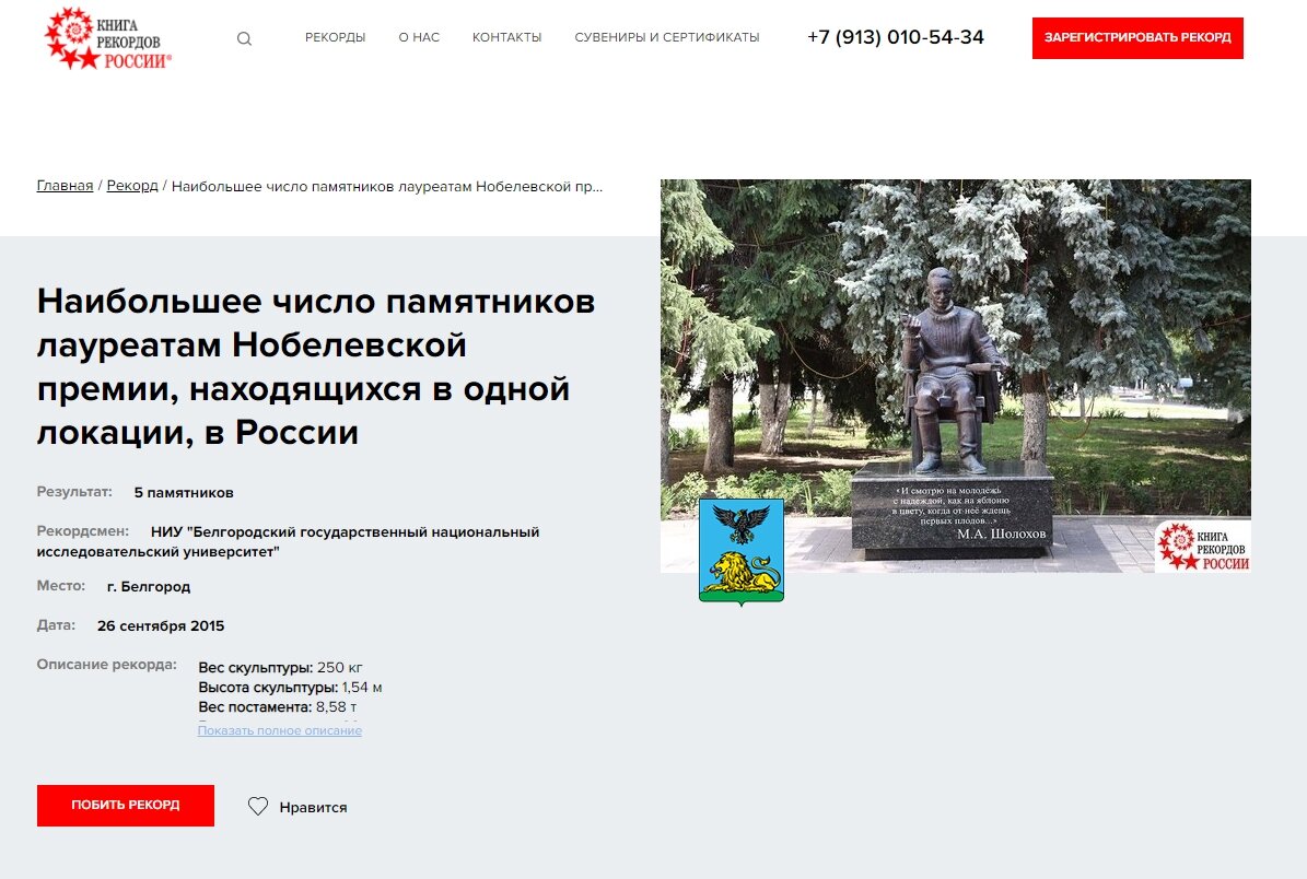 «Наибольшее число памятников лауреатам Нобелевской премии, находящимся в одной локации, в России» — так официально называется рекорд, установленный Белгородским государственным национальным исследовательским университетом и занесённый в Книгу рекордов России.