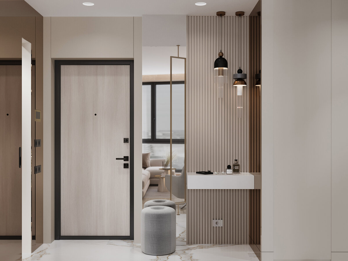 Металл в интерьере квартир и домов прочно занял позицию популярного способа декорирования пространства. Популярность его использования обусловлена общей тенденцией на использование натуральных материалов и возможностью создавать уникальные предметы, что обусловлено характеристиками металла. Этот эстетически оправданный прием наделяет помещения особым характером, настроением и добавляет нотку индивидуальности. В дизайн студии Art Concept мы следим за новыми тенденциями и воплощаем их в наших проектах, так как нам хочется создавать интерьеры, которые будут актуальны еще долгое время. Причиной популярности бронзы и латуни в частности можно назвать теплоту, которой наделяют эти виды металла пространства. Приятный солнечный оттенок задает настроение помещению, формирует оригинальность, а также подчеркивает единство общей концепции. В дизайн проекте квартиры в ЖК Wellton Towers – сохранение единого стиля было одним из основных пожеланий владельцев. Уже на входе в прихожую можно отметить идеа