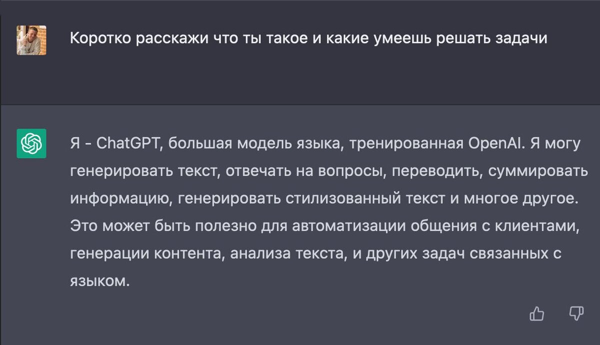 А вы слышали о ChatGPT? Нагуглить, конечно, можно. Но Павел Кореневич, ментор Клуба, решил спросить напрямую у самого чат-бота. Расскажи, что ты такое и какие умеешь решать задачи. Результат вы можете видеть на фото. Да, немного "корявая" формулировка запроса, но это связано с англоязычным происхождением бота. Зато какой ответ! Ощущение, что с тобой общается живой собеседник, а не искусственный интеллект. Этим и обусловлена невероятная популярность нейросети и даже опасения, что она заменит не только поисковики, но и некоторые профессии! ChatGPT превосходит аналоги по глубине, выдавая развернутые ответы почти на любой вопрос, даже специальный. Убедиться в этом можно, задав вопрос боту, например, о его пользе для стартапов. Ментор Павел Кореневич поделился своим user experience: Я уже давно тестирую ChatGPT с разных сторон. Ну как тестирую - играюсь, как и многие. Изучаю его возможности. Но уже точно могу сказать, что при правильно составленном запросе, эта штуковина умеет творить прекр