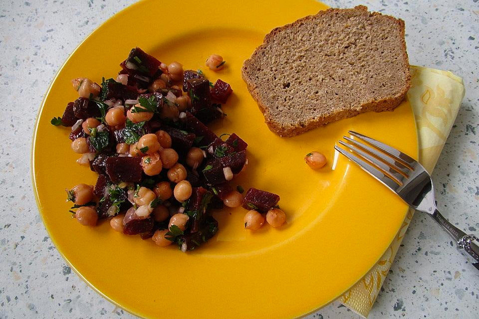 Сегодня очень зимний и очень полезный, кстати, салат. Из нута и свеклы. По нынешним временам – сезонный, потому что нут в каждом магазине уже практически имеется – в том или ином виде. Для салата можно взять консервированный (уже готовый нут) или отварить сухой. С сухим возни немного побольше – потому что его придется замочить минимум на ночь и потом варить пар часов. Берем: Как готовим: Свеклу моем, оборачиваем фольгой и запекаем в духовке до готовности. Если нут сухой – заранее замочив отвариваем. Консервированный – просто сливаем жидкость. Лук режем мелкими кубиками, зелень – рубим. Свеклу и нут остужаем, свеклу – нарезаем кубиками и смешиваем с луком, нутом и зеленью. В банку с крышкой наливаем масло и уксус в равных долях, добавляем соль, тмин и перец и хорошенько трясем – чтобы заправка взбилась. Поливаем салат, перемешиваем и даем настояться минут пятнадцать. Приятного аппетита!