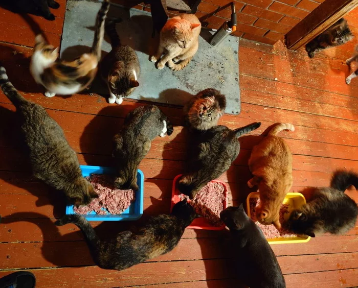 Когда я вернулась домой в начале первого, я не хотела делать фарш или вообще как-то трудится, но коты меня убедили в необходимости мясной добавки. Были головы, суповой набор, ноги и кабачок. После таких ужинов, можно дрыхнуть часами (как это делает Тамара)