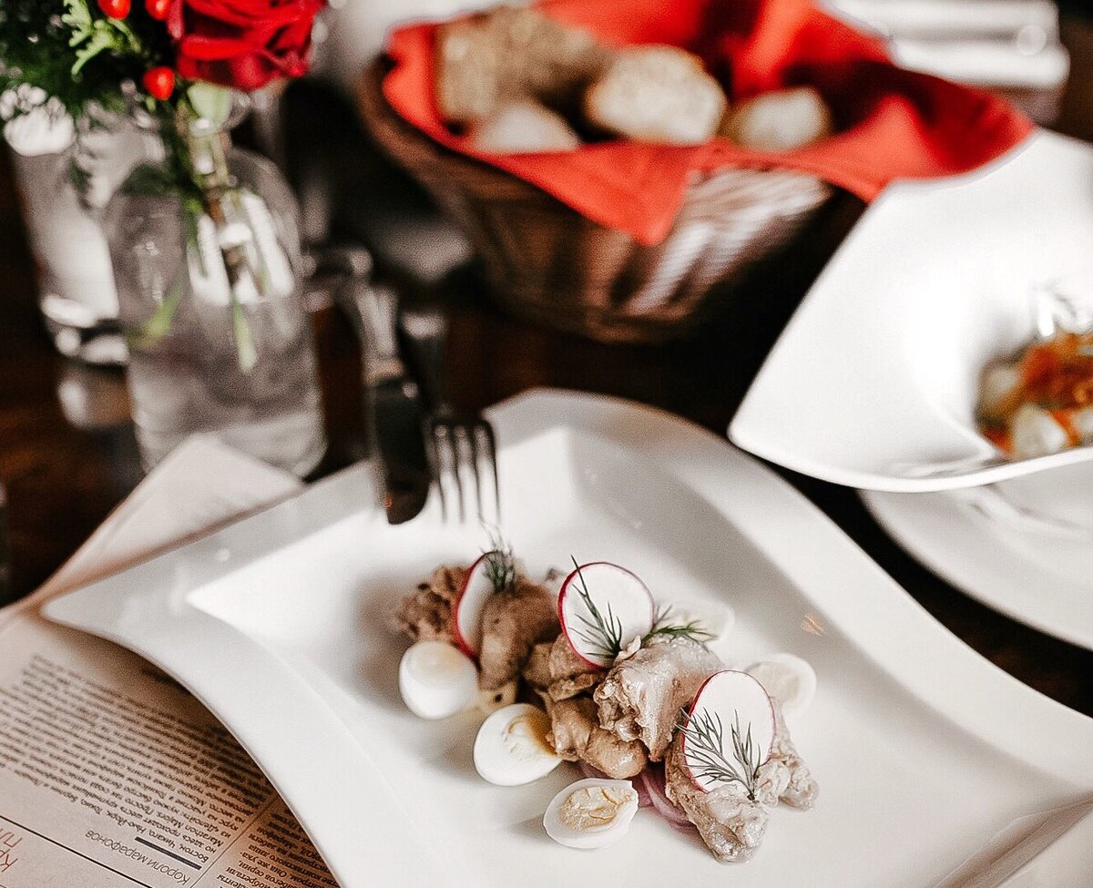 Тем, кто до сих пор относится скептически к печени трески, пришло время распрощаться со стереотипами — это главный источник витамина D. В «Воронеже» ее подают со сладким луком, вареными перепелиными яйцами (не забываем про желток!) и хрустящим редисом. Не готовы есть это блюдо без всего? Тогда не забудьте про хлебную корзину. Темный конопляный хлеб станет отличным соратником для этого блюда.