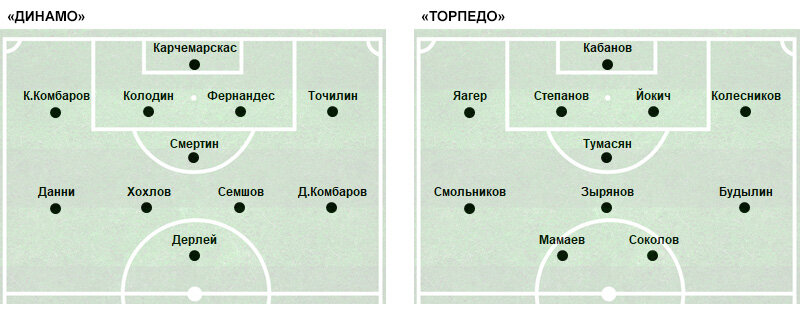 «Динамо»: Карчемарскас, Колодин, Точилин, Фернандес, Семшов, Смертин - к, Д.Комбаров, Хохлов, К.Комбаров, Данни, Дерлей.