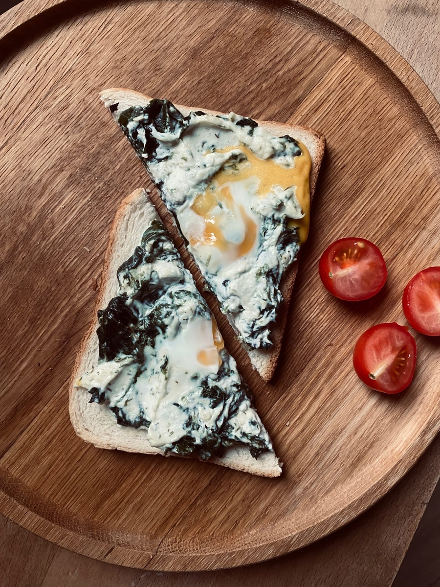 Сэндвич со шпинатом, творожным сыром и перепелиным яйцом