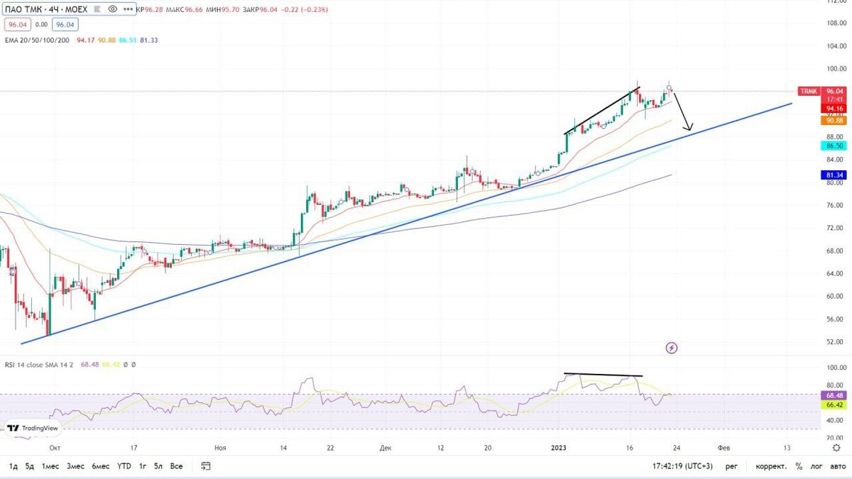 Речь пойдет о Трубной металлургической компании ($TRMK). За последние полгода акция выросла на 70%, компания объявила дивиденды 6,78₽, в связи с чем начали поступать вопросы по ней. В 2022 году цены на сталь, из которой ТМК производит трубы сильно упали в цене за счёт повышения предложения стали внутри страны. В связи с чем себестоимость труб упала и маржа выросла. Поэтому компании удалось заработать 20 млрд (19,6₽ на акцию) за первое полугодие 22 года. 👉На 4ч графике сформировался дивер, при этом двигается акция в рамках растущего тренда. Первая цель коррекции: 88,5₽ (трендовая линия). Краткосрочно здесь делать нечего. Долгосрочно – тоже. Перспективы развития очень туманны, а дивидендной политики у компании просто нет😂 Хотят – выплачивают дивиденды в долг в интересах основного акционера, хотят – кидают на дивиденды. Короче, делать здесь нечего, ни краткосрочно, ни долгосрочно. Подписывайтесь на блог. Жду ваши мысли по ТМК в комментариях.