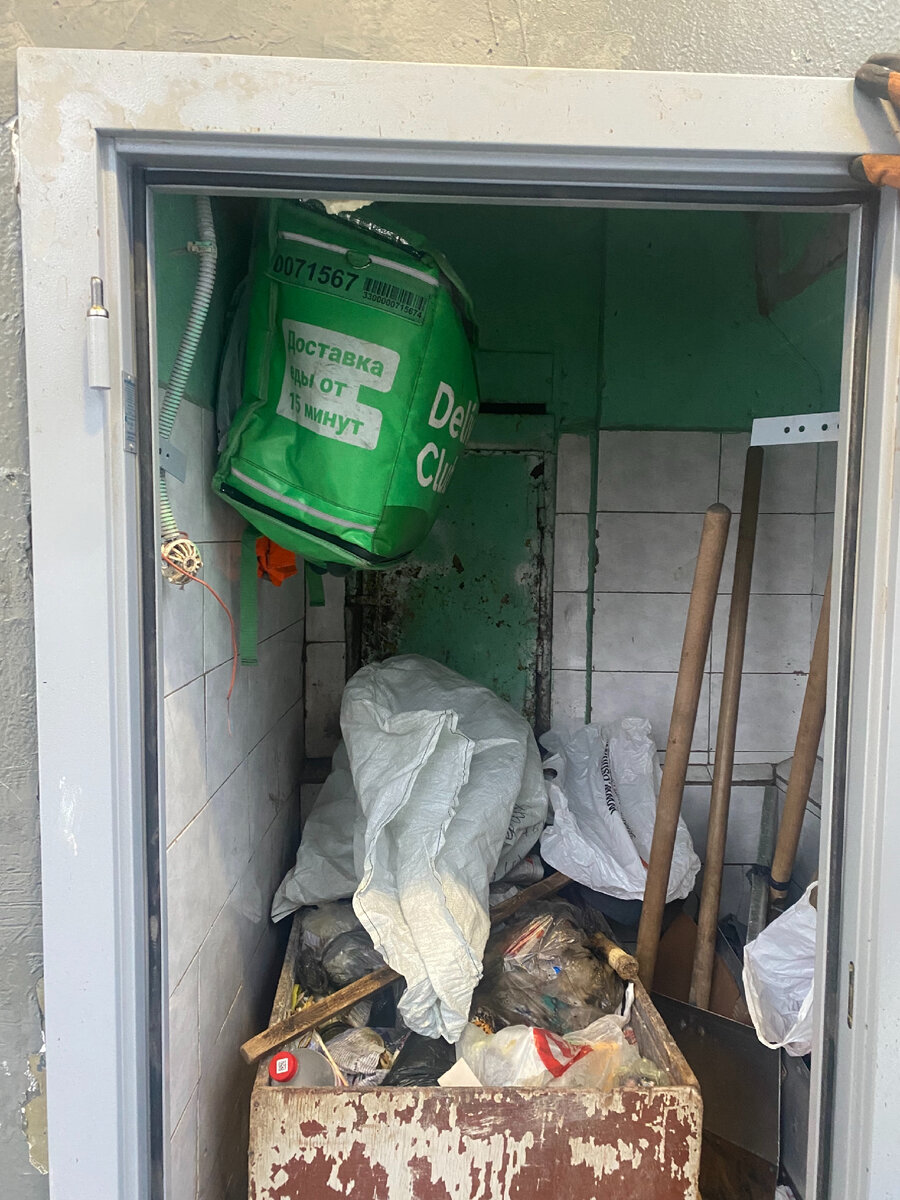 Приветствую всех на канале «всё обо всём». За несколько дней перед Новым годом мне довелось устанавливать противопожарные двери в многоквартирном доме на юго-западе Москвы. Установив люки выхода на чердак мы с ребятами спустились на первый этаж ставить дверь на улице в мусорокамеру, не дожидаясь пока придёт дворник и откроет мусорку я решил просто сломать дверь, так как всё равно сейчас туда будет установлена новая металлическая. И что же мы увидели выломав дверь в эту «тайную комнату»!!!! А то же самое, что и вы видите на фото- в мусорокамере среди тараканов, кучи разных насекомых и ужасной вони висит сумка для доставки продуктов Дилевери!! Дворник по имени Насим пришёл через 10 минут и я спросил у него: друган, а для чего тебе сумка из Дилевери? На что он мне ответил: брат, я с 9 до 18 часов работаю дворником, а после разношу доставку еды, семью надо кормить вот и приходится на 2 работах пахать. Он конечно молодец, что трудится без отдыха, но то что он днём эта сумка висит в мусорок