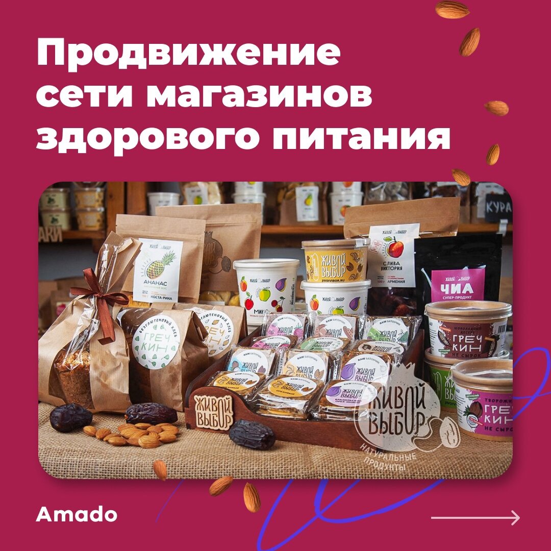 Сегодня расскажем, как с помощью этого инструмента мы привлекли покупателей для сети магазинов здорового питания. «Живой Выбор» — пермская сеть магазинов, в которых продаются натуральные органические продукты: сухофрукты, орехи, зеленая гречка, продукты для веганов и прочее ПП. Продукция реализуется в интернет-магазине, а также в собственных торговых точках офлайн. Задача, которую поставил перед нами заказчик — рост числа покупателей как офлайн, так и онлайн. Приступаем к работе! ✔ Мы разработали и предложили клиенту следующую стратегию продвижения: Реклама на аудиторию, которая живет рядом с магазинами
