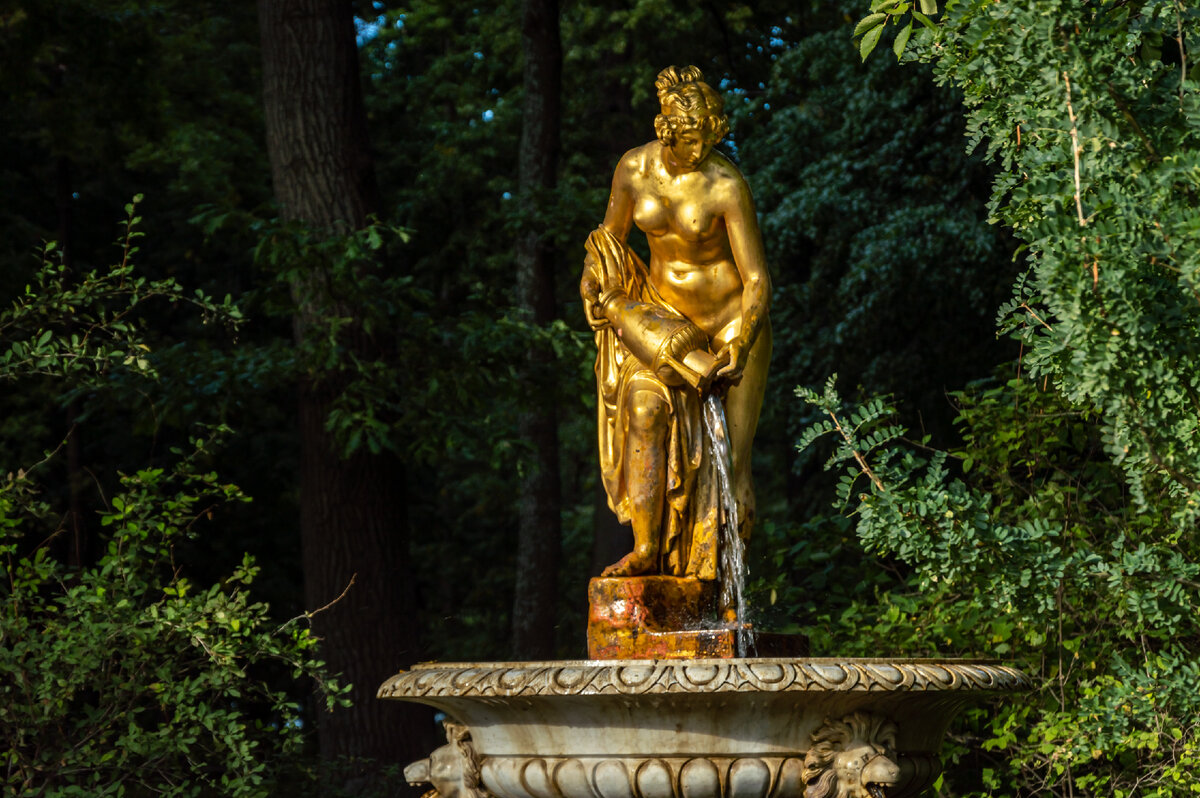 Я искала именно её. Потому что именно с Данаиды началась моя любовь к Петергофу. Увидела я эту скульптуру впервые еще в детстве в пачке открыток, которую помню почти столько сколько себя. Долго ее рассматривала, ошарашенная красотой линий, настроением, продуманностью позы, плавностью форм. Я тогда не знала мифа о дочерях Даная, а просто любовалась шедевром. Данаиды — пятьдесят дочерей Даная, правителя Ливии (за 775 лет до основания Рима). Царю предрекли смерть от руки зятя и Данай не хотел, чтобы его дочери выходили замуж. Но его племянники, пятьдесят сыновей его родного брата Египта, силой принудили царя выдать за них дочерей.
