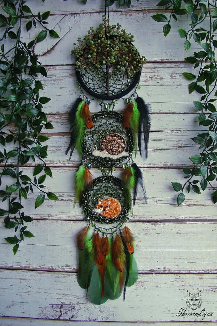 Аппетит приходит во время еды - думаю каждый раз, глядя на фото этого ловца. Потому что начиналось все с вопроса "а улиточек у вас нету? Парень коллекционирует фигурки", а в процессе обсуждения захотели лесную атмосферу, дерево и лису. Получился большой ловец с глубоким личным смыслом. Просто обожаю, когда говорят "я доверяю твоему вкусу, сделай мне красиво". Это делает работу особенно приятной, и хочется приложить втрое больше усилий для идеального итога. Нет, это не значит, что обычно я плету тяп-ляп и побыстрее! Просто к удовольствию от процесса добавляется еще и азарт "а что будет, если сделать так?", и результат получается живым и душевным. Дизайн улиточки честно подсмотрела в инете. Полностью вышитая бисером, фактурная и достаточно крупная, размером с ладонь. "Приличная лиса должна быть толстенькой и круглой" - хором сказали все, когда я засомневалась в процессе ее вышивки =) А еще я упорно вижу, что она сделана не из бисера, а из икры =) Собирать подобные деревья - как заниматьс