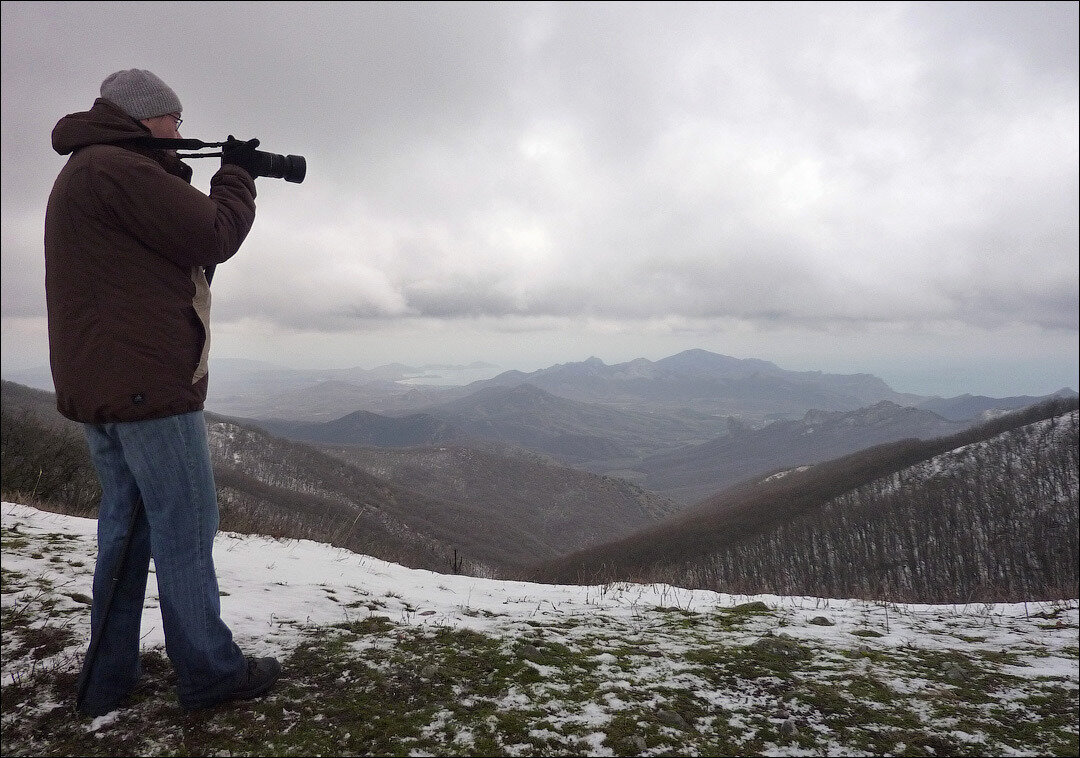 В сторону Старого Крыма тоже очень интересные виды, но отсутствие времени не дало возможности подняться к самой вершине Туар-Алана, чтобы увидеть более открытую панораму, не сквозь лес же снимать. Да и с погодой, к сожалению, не повезло. Серое небо, слякоть под ногами — в ботинках уже у обоих к тому моменту хлюпало, — стремительно приближающиеся сумерки не позволили в полной мере насладиться окружающими пейзажами и сделать стоящих фотографий. Но мы были уверены, что точно сюда ещё вернёмся! И возвращались, и не раз!
