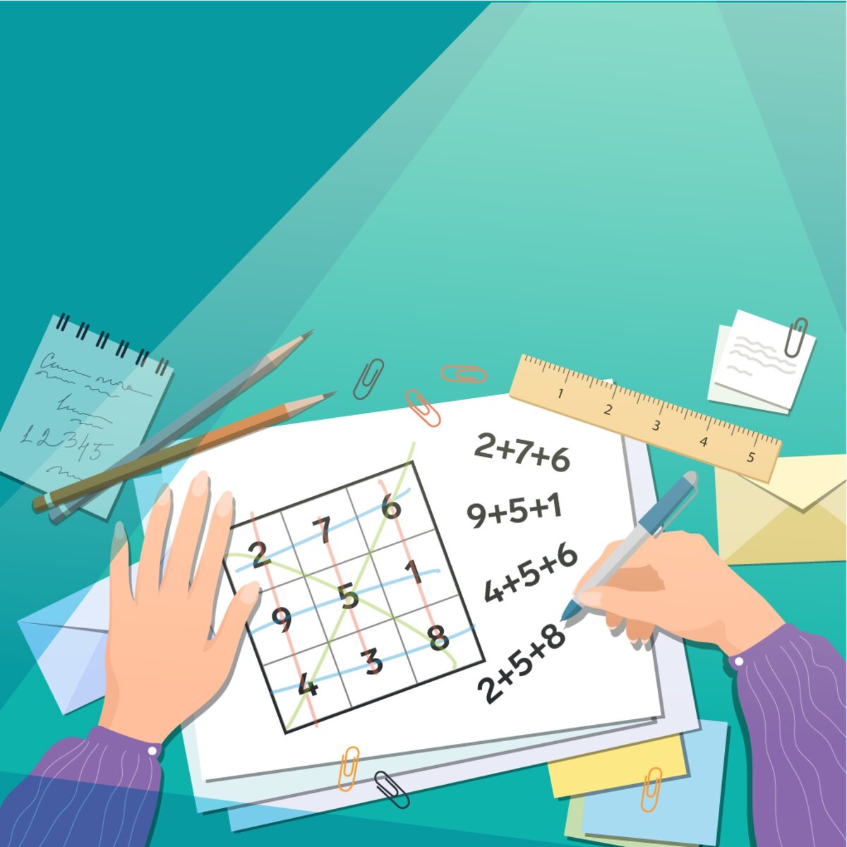 Условие В клетки таблицы 3×3 расставлены числа 1, 2, ..., 9 (каждое из этих чисел встречается ровно один раз). Рассмотрим восемь сумм из трёх чисел: по трём строкам, по трём столбцам и по двум большим диагоналям. Верно ли, что если семь из этих восьми сумм равны между собой, то и восьмая сумма им равна? Видеоразбор