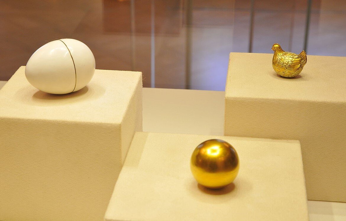 Первое пасхальное яйцо, заказанное Фаберже Александром III в 1885 году, было изготовлено из золота, покрыто белой эмалью, а внутри- золотой желток, в котором сидела курица из цветного золота. Внутри курицы был сюрприз- миниатюрная императорская корона и подвеска в виде рубинового яйца. Именно с этой вещицы началась в царской семье традиция дарить на Пасху яйцо фирмы Фаберже.