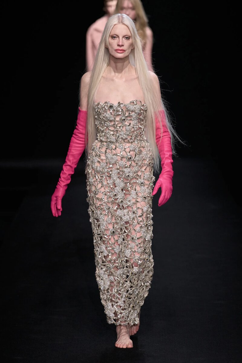 Показ кутюрной коллекции Valentino прошел на Неделе высокой моды в Париже. Самым вирусным моментом шоу стало падение 58-летней модели Кристен Макменами. Судя по всему, дело было в неудобной обуви — после падения модель нервно сорвала туфли и понесла их в руках, продолжив дефиле босиком, после чего вообще выкинула их в стороны. На прошлом показе Valentino в октябре модели тоже спотыкались и падали. Скрыть это было невозможно, и модный дом даже выпустил официальное заявление, в котором сослался на уличный кастинг — не все модели были профессиональными. Впрочем, и у Макменами это не первое падение. На показе осенней коллекции Jean Paul Gaultier она также не удержала равновесие на высокой платформе.