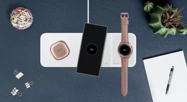 Следующий участник подборки -Samsung EP-P6300. Эта зарядка станет отличным выбором для тех, у кого имеется 2 смартфона и GalaxyWatch, либо, вместо одного из смартфонов беспроводные наушники GalaxyBuds. Каждое устройство нужно помещать в зону, предназначенную для него. Имеет функцию быстрой зарядки. Дизайн простой и лаконичный, есть светодиодные индикаторы. Выполняется в белом и черном цветах, позволяющих дополнить имеющийся интерьер. LED-индикация разноцветная в зависимости от выполняемой задачи. На ночь ее можно приглушить. Станция позволяет осуществлять зарядку при использовании большинства чехлов. Помимо смартфонов SamsungGalaxy позволяет заряжать многие устройства Apple. В комплект входит сетевая зарядка с функцией быстрой зарядки, USB-C, руководство пользователя. Предельное напряжение — 9 В. Сила тока — 2,77 А. Оснащена 3 разъемами. Конструктивно представляет собой платформу.