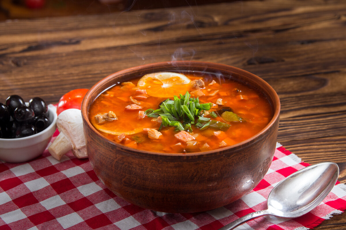 У традиционной солянки несомненно имеются свои любители и почитатели. Ее готовят во многих ресторанах и кафе, она настолько ароматная, что влюбит в себя с первой ложки. При этом она достаточно калорийная и сытная, большие куски мяса и разнообразные виды колбас не оставят голодным даже самого заядлого мясоеда. У каждого повара в рецепте этого супа есть свои секреты и тонкости, каждая хозяйка вкладывает в него свою изюминку, не бойтесь экспериментировать, быть может ваш вариант окажется самым вкусным, любое классическое блюдо можно ориентировать под свои приоритеты. Для приготовления бульона: Для приготовления супа: Для приготовления зажарки: Для подачи: Пошаговый рецепт: Для начала поставим вариться бульон: Тем временем: Готовим суп: Зажарка для супа: Подать к столу в горячем виде, украсить свежей зеленью петрушки и дольками лимона, в каждую тарелку добавить столовую ложку жирной сметаны.