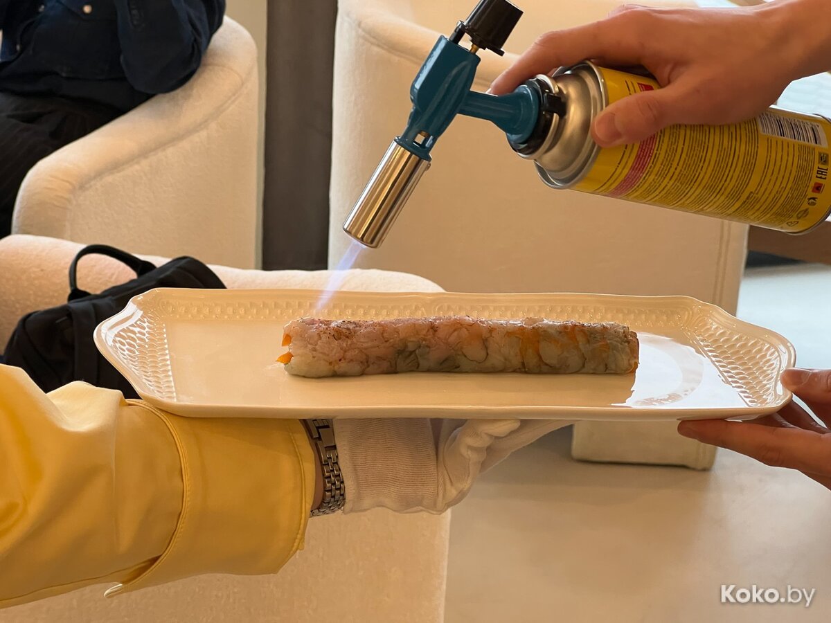 2. На вид сырая колбаска, но замаскированная замаринованная хурма соломкой, плотно скрученная в крудо из сырых креветок в луже кисло-острого перуанского соуса «Молоко тигра», как севиче заправляют. Верю, читается бредом сумасшедшего, но это чистая правда.