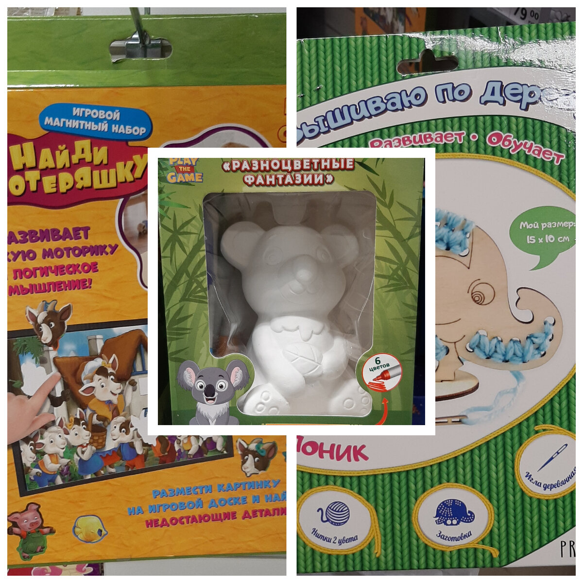 В магазине Фикс прайс большой выбор увлекательных игр для малышей. 1. Алмазная мозайка. Учит усидчивости, развивает мелкую моторику, мышление, прививает любовь к творчеству. 2. Вышивка по дереву. Игра обучает шитью, творческий процесс развивает фантазию. 3. Пазл. Развивает мелкую моторику, координацию рук и глаз, развивает навыки мышления, вырабатывает терпение, решение задач. 4. Различные раскраски. Развивают фантазию и воображение, учат усидчивости и сосредоточенности. 5. Игровой магнитный набор. Развивает мышление и логику. 6. Картинки из пластилина. Отлично развивают мелкую моторику. И это еще не все игры! А какие игры нравятся вашим деткам?) Спасибо всем за внимание! Желаю приятных покупок! До новых встреч!)
