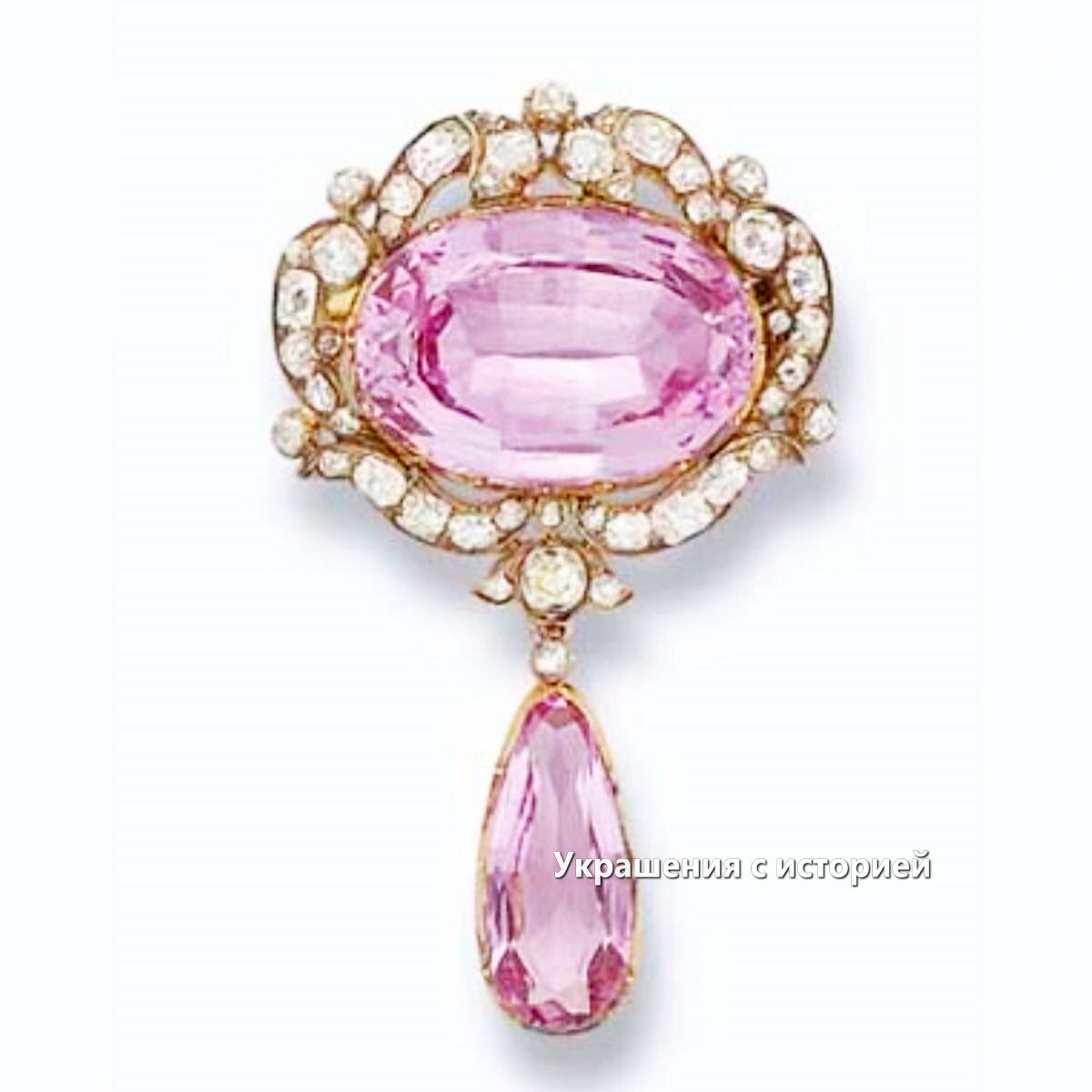 Королева Мэй – Мария Текская – безумно любила драгоценности и собрала выдающуюся коллекцию. Для нас самыми интересными и резонансными её приобретениями были и остаются драгоценности Русского императорского дома, однако и другие её украшения тоже чертовски хороши:) Например, броши из гигантского алмаза Куллинан или знаменитые Кембриджские изумруды. Самые лучшие драгоценности Мария Текская оставила казне, передав их в Королевский фонд. Но всё же и остальным наследникам перепало немало. Уж, во всяком случае, было, что продать на аукционах. Разумеется, королеве Мэй не хотелось, чтобы любовно собранные вещи пустили с молотка, но что она могла сделать? Вот, например, эта топазовая брошь. Королева Мария купила её в 1901 году, но датируется вещь 1860-ми годами. Основа броши сделана из золота и серебра, центральный розовый топаз огранён в форме подушки, подвеска с грушевидным топазом съёмная, топазы дополнены бриллиантами. От Марии Текской брошь, очевидно, перешла к королеве-матери Елизавете Бо